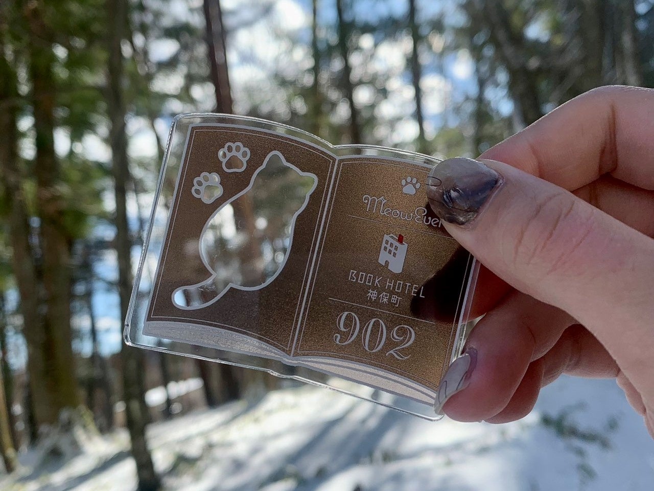 本の中にミャウエバー、そして宿泊されるお部屋番号が入った特別なデザイン。ミャウエバーが透明になっているので空や雪景色、お花畑などにかざすとまるでミャウエバーが新しい色や柄にお着換えしたみたい!