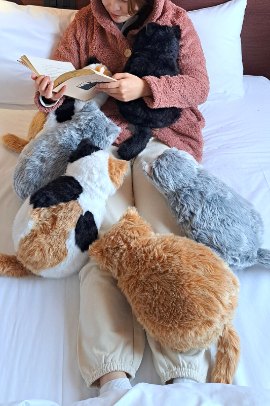 お部屋では6匹のミャウエバーと猫にまつわる素敵な本や写真集があなたをお出迎え。滞在期間中はミャウエバー撫で放題です!