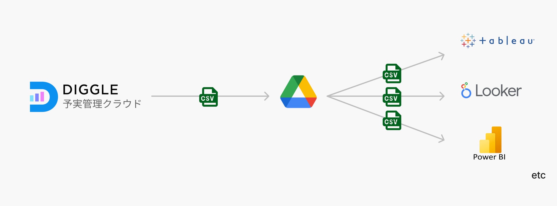 今回開発した機能は、各種BIツールに直接インポート可能な形式のデータを、フォルダとファイル名を指定してGoogle Drive™️に出力する機能です。一度連携設定を行うと、「DIGGLE」上でボタンを押すだけで予算・見込・実績の指定項目のデータがCSV形式でGoogle Drive™️に出力・同期されます。これにより、Google Drive™️内のデータにアクセス可能なBIツールを用いて、リアルタイムな経営データの可視化が可能になります。BIツールを活用した経営管理業務において、業務効率化と、高度な分析及び経営判断の迅速化を実現できる機能です。