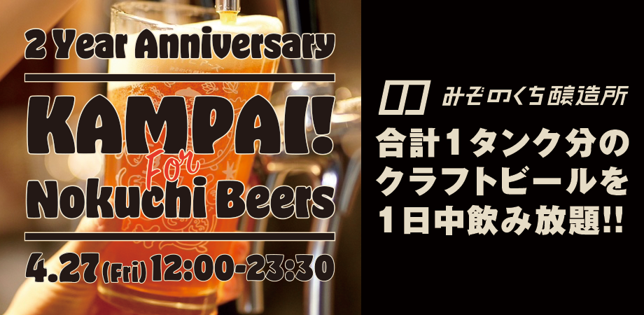 【みぞのくち醸造所、開業2周年記念】クラフトビール1日中飲み放題イベント「KAMPAI for NOKUCHI BEERS!!」を4月27日(土)に開催