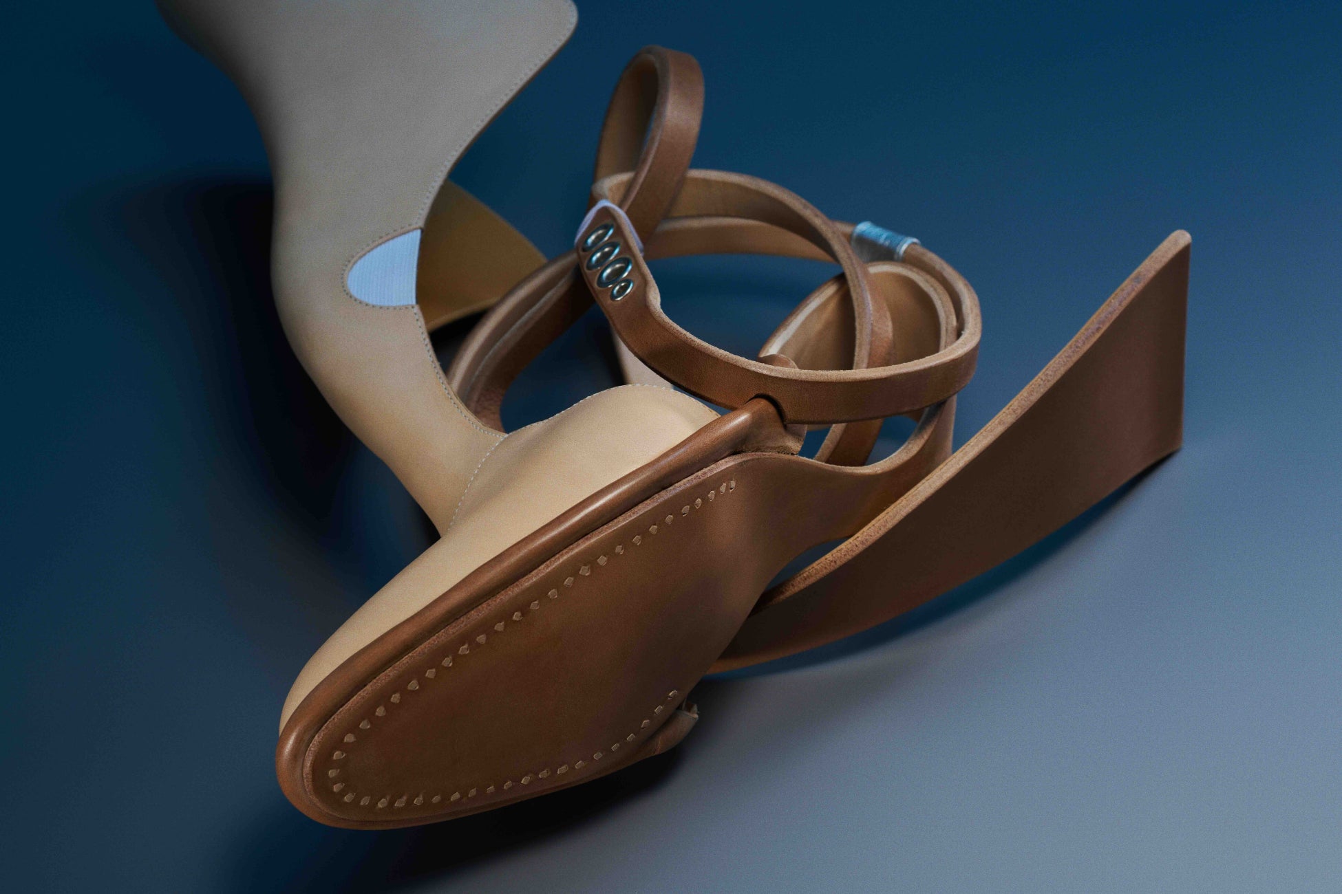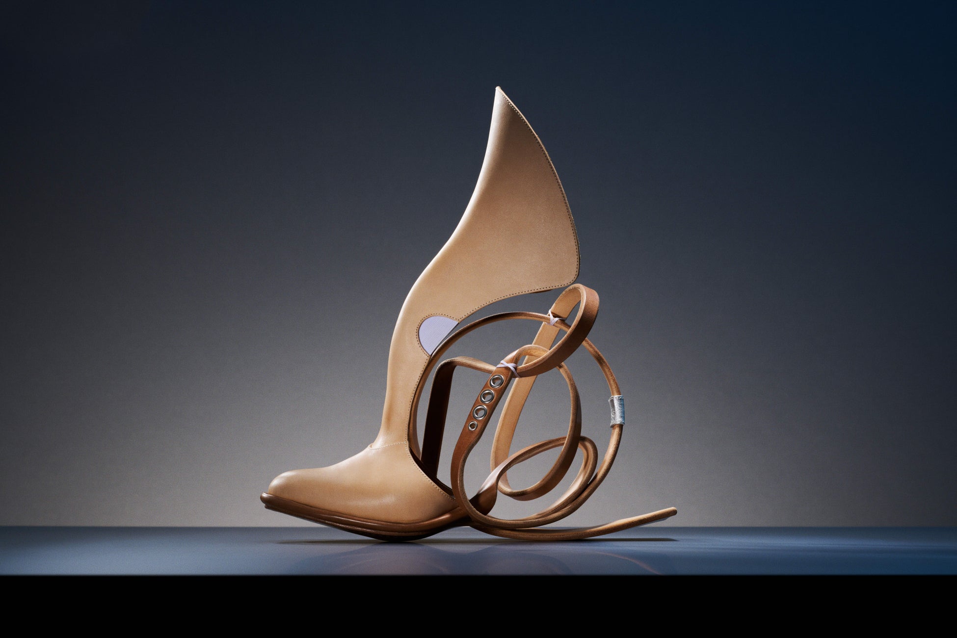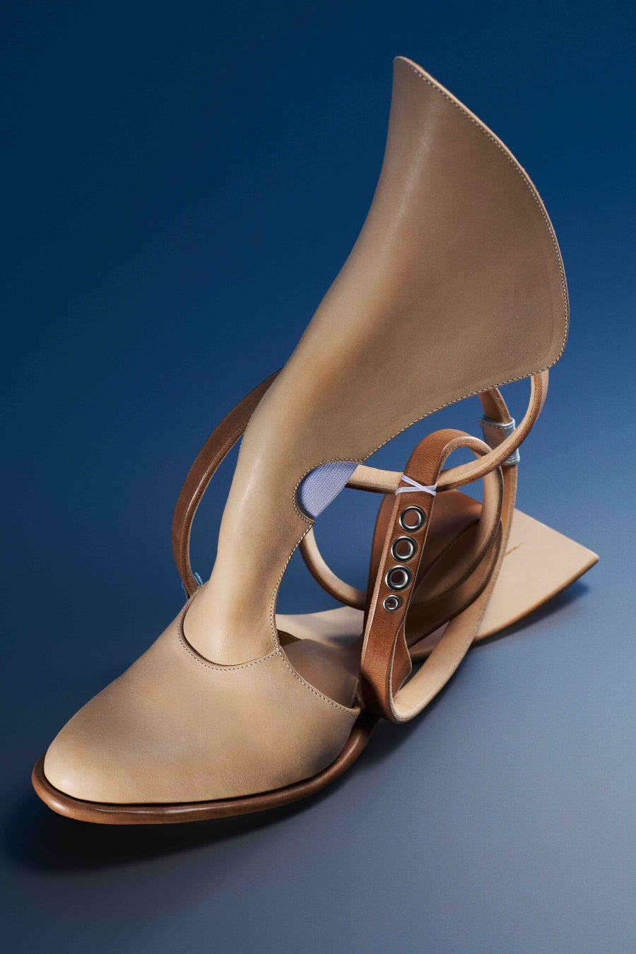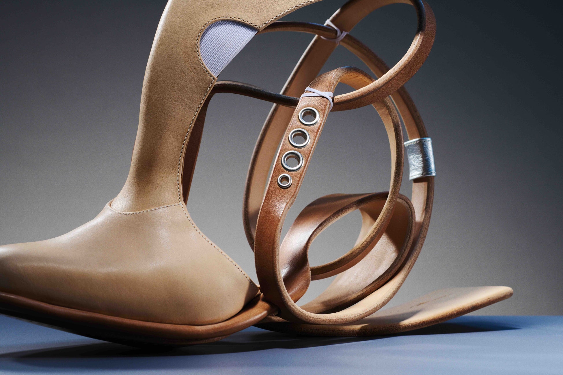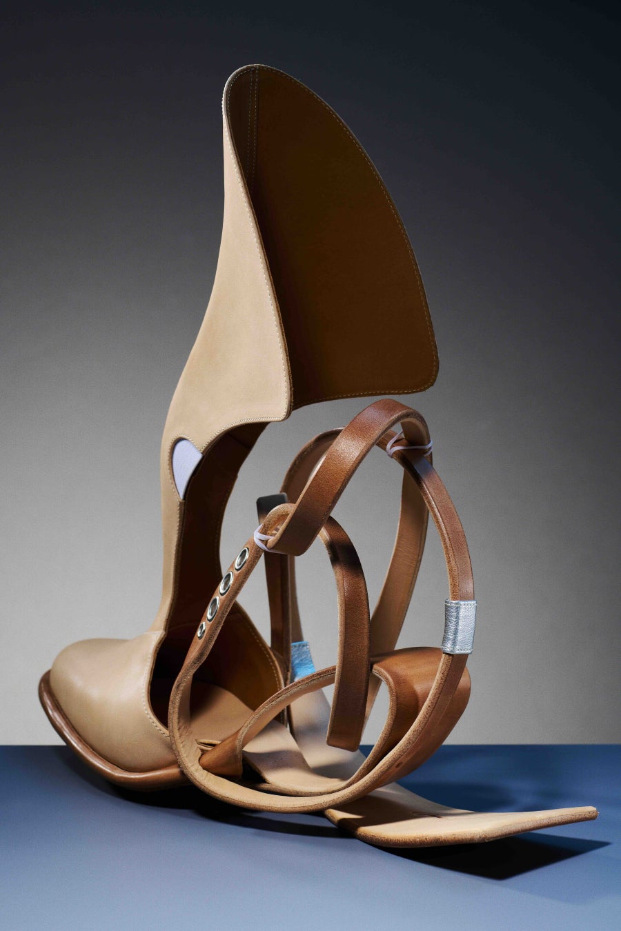 音楽的構造と靴の形態・機能を融合させた作品です。 管楽器ホルンの曲線や音の通り道に着想を得て、インソールとアウトソールを繋ぐウェルト部分を空洞構造とすることで、視覚的な造形だけでなく、楽器の本質的な構造を靴の設計へと落とし込んでいます。素材には、未着色で経年変化を受け入れるヌメ革を採用。誤魔化しの効かない素材と真正面から向き合うことで、時間とともに完成していく作品性を内包しています。本作はアート作品として鑑賞可能であると同時に、実際に履くことのできる靴として成立しており、視覚と身体感覚の双方に訴える表現を試みています。