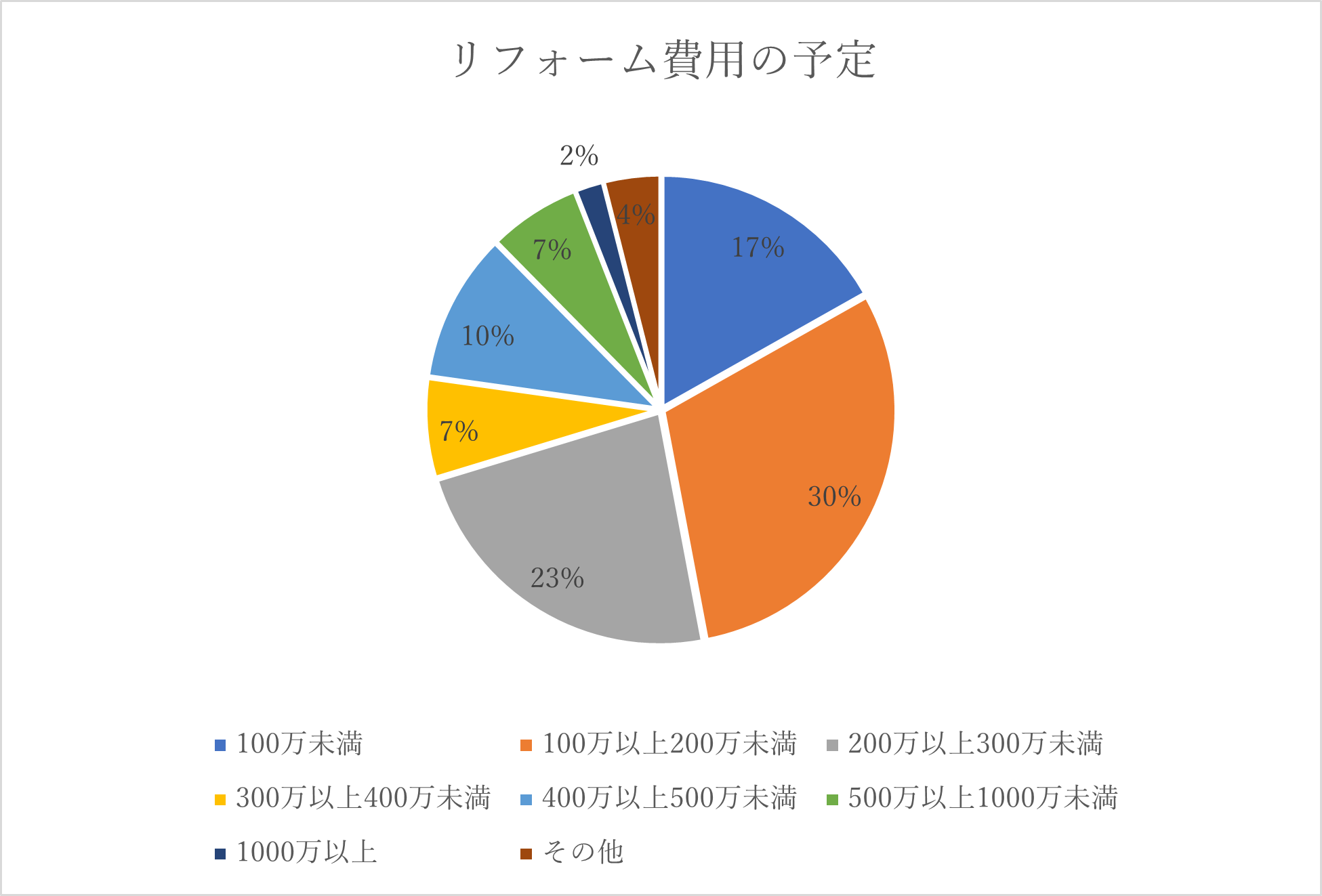 リフォームの費用は、最も多い回答が「100万円以上200万円未満」で30%、「100万円未満」が17%となり、200万円以下のリフォームに留める方が約半数であることがわかりました。