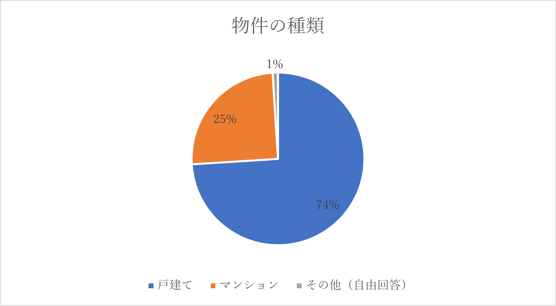 自宅の種類は「戸建て」が74%、マンションが25%であることがわかりました。やはり、シニア層はマンションよりも戸建てに住んでいる方が多いようです。