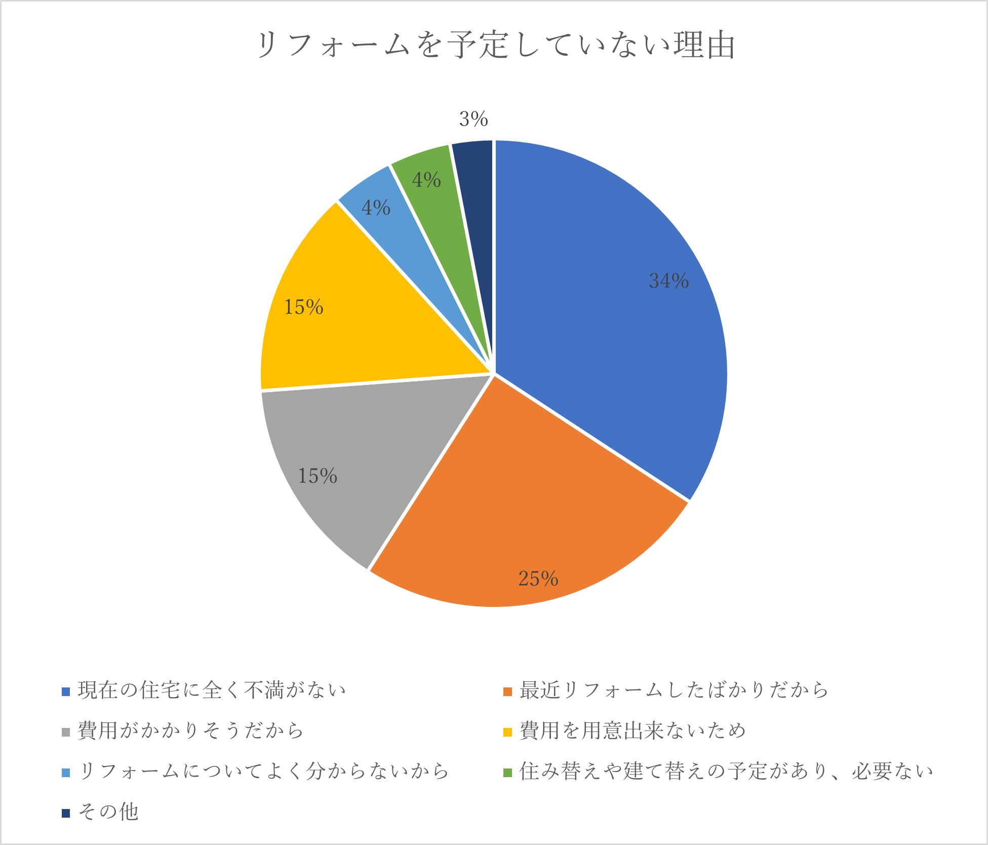 リフォームを予定していない理由は、「現在の住宅に全く不満がない」という理由が34%でした。また、既にリフォームを実施済の人も25%おり、リフォームを予定していないシニアの方の約6割はライフスタイルに合った自宅に住んでいることが推察されます。