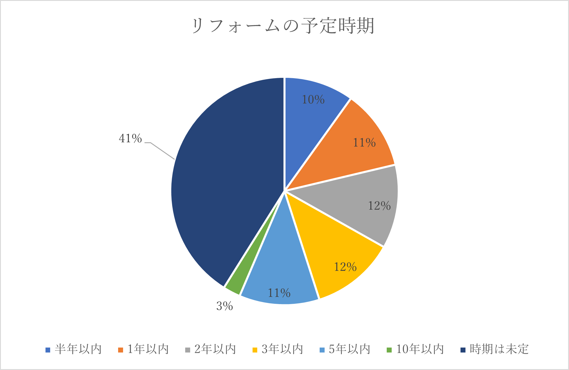 リフォームの予定時期は「半年以内」が10%、「1年以内」が11%と、1年以内にリフォームを計画している人が約2割いることがわかりました。また、未定が4割であることから、いずれリフォームが必要と考えているが、それほど緊急度の高いリフォームではないことも推察されます。