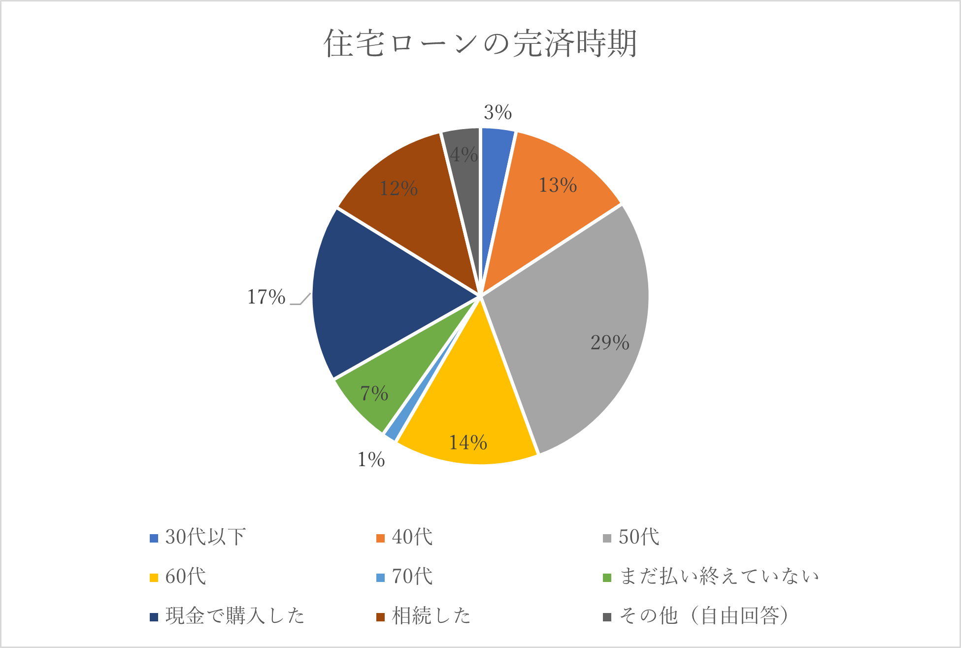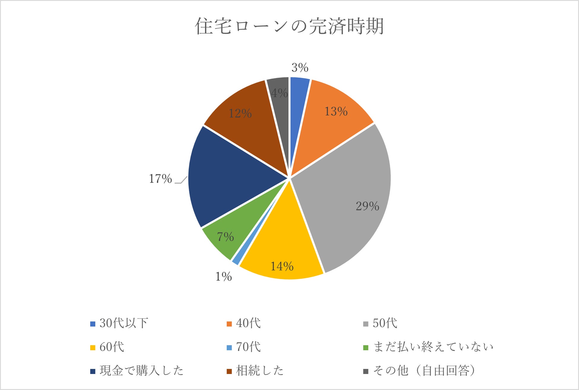 住宅ローンを50代で完済した方が29%と最も多い回答となりました。また、「現金で購入した」、「相続した」という方を足し合わせると29%となり、そもそも住宅ローンを借りていない方も多く、返済中の方はわずか6%という結果となりました。