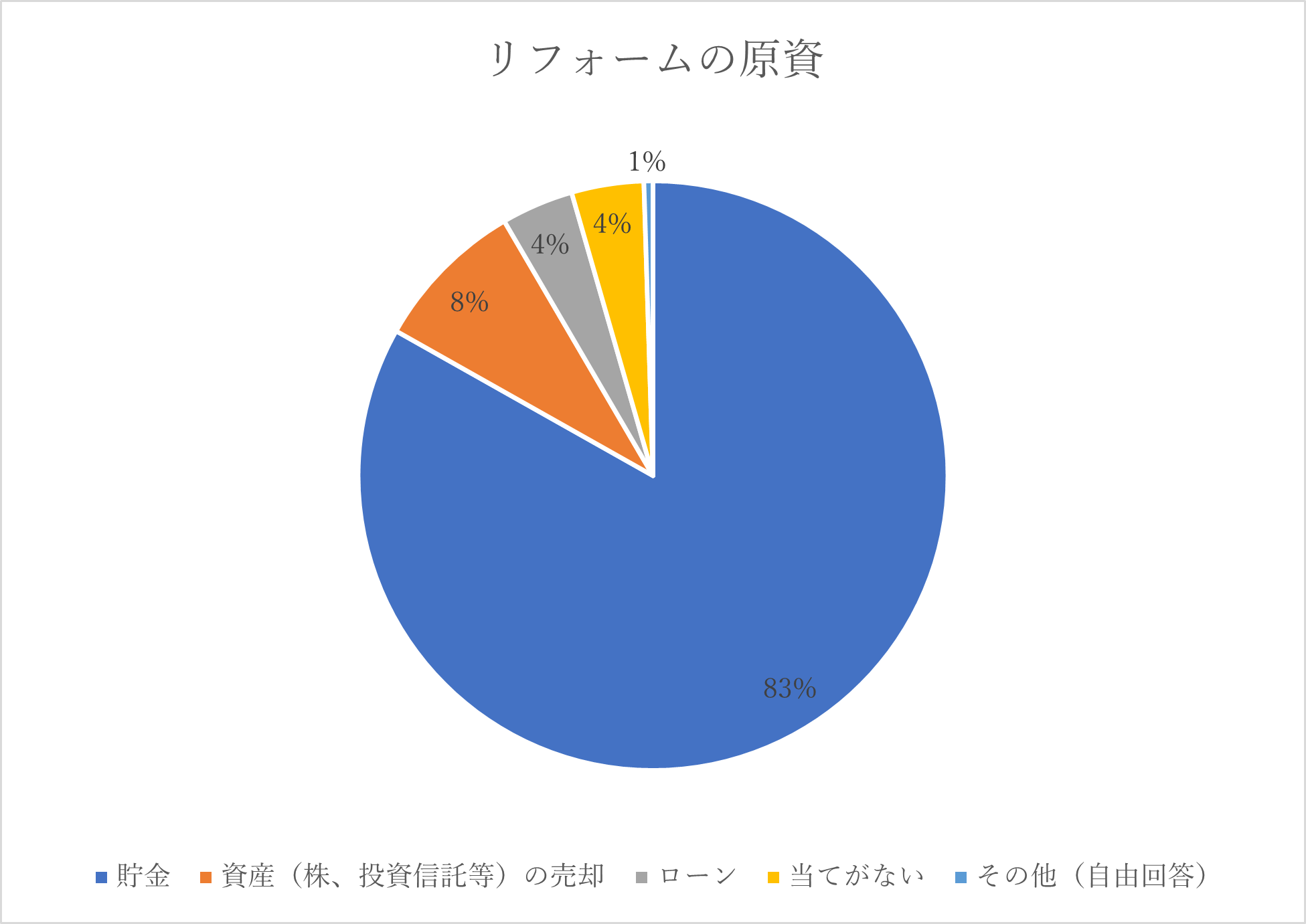 リフォーム費用は、約8割の方が貯金から準備する予定であり、「資産(株、投資信託等)の売却」を足すと9割以上となります。このことから大半の方が保有する資産の中からリフォーム費用を準備することがわかりました。