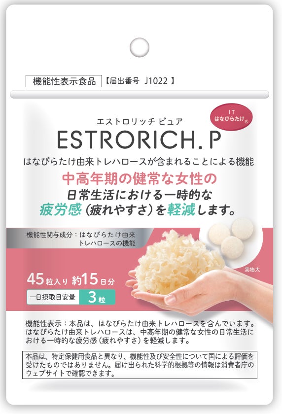 当社の連結子会社である株式会社インタートレードヘルスケア(本社:東京都中央区、代表取締役:内藤 敏裕、以下「インタートレードヘルスケア」という。)は、2025年3月 消費者庁に機能性表示食品の届出が受理されたことを受け、中高年期の健常な女性の日常生活における一時的な疲労感を軽減する「はなびらたけ由来トレハロース」を含む機能性表示食品「ESTRORICH.PURE(エストロリッチピュア)」を発売します。