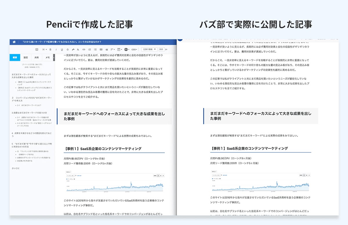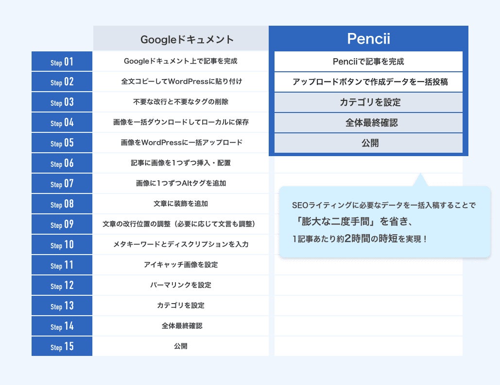 Pencii(ペンシー)は、こうした無駄を削減し、執筆者が本当に大切な作業に集中できる環境を提供するために開発されました。入稿作業を自動化することで1クリックで完了。タイトルやコンテンツの中身のブラッシュアップにより時間をかけることができるようになります。