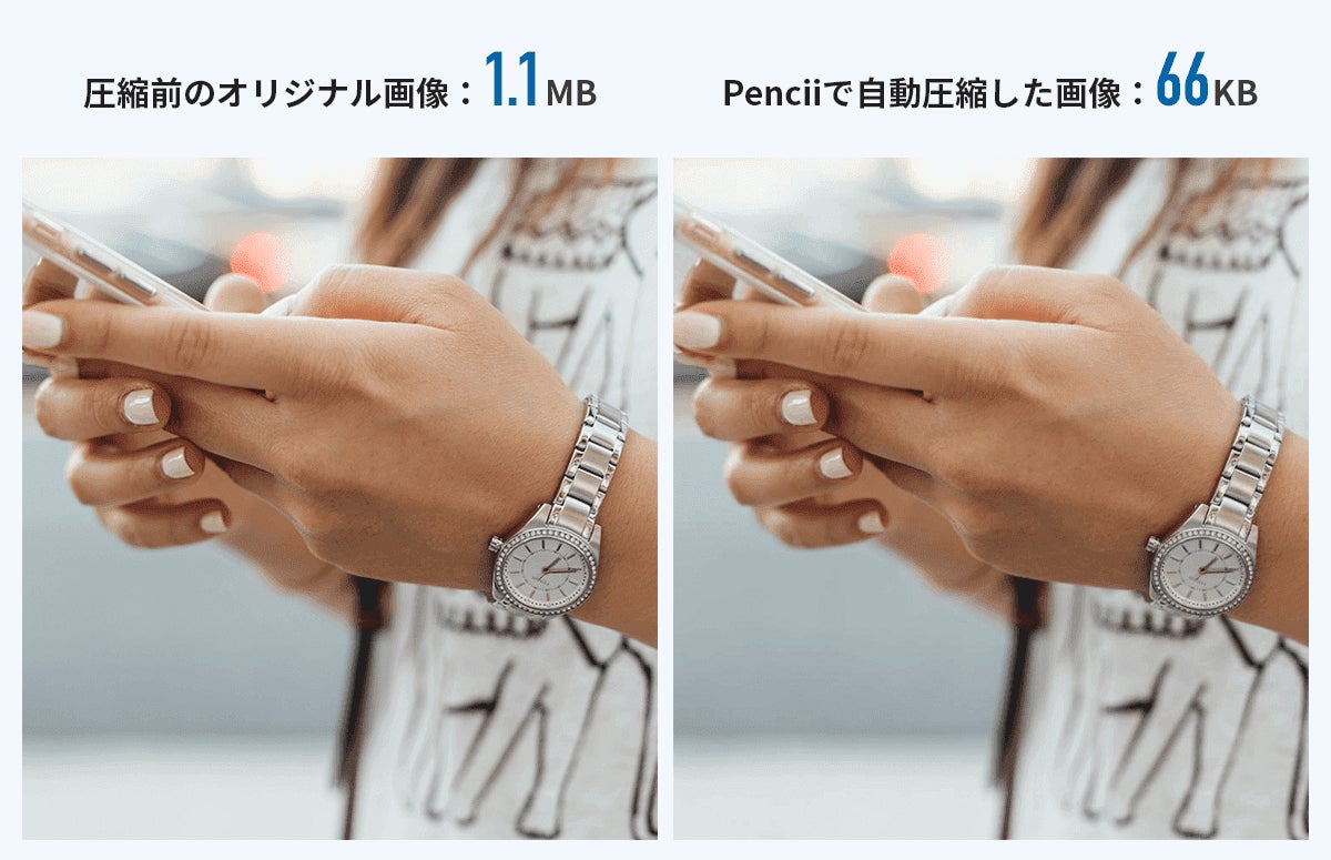 Penciiでは、挿入された画像は全て自動で最適サイズに圧縮。画像の品質はそのままに、サイトのスピード改善に貢献します。