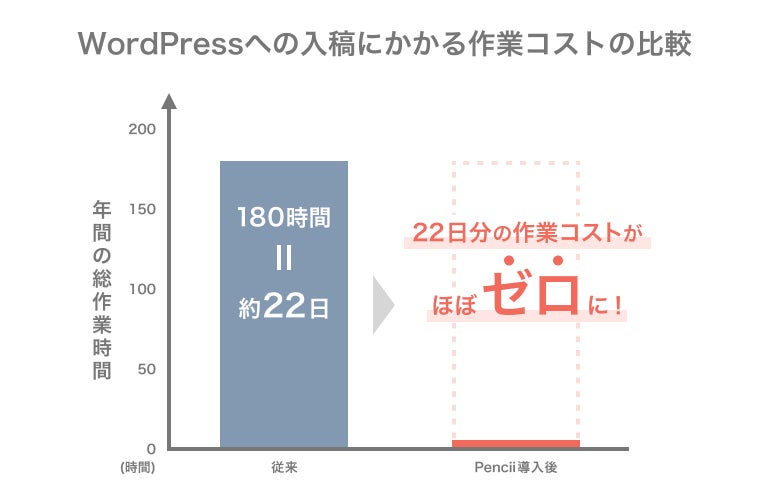 1記事あたり1.5時間かかったとして、月10記事で15時間、年に換算すると180時間。社員1人のリソースが月に2日分、年間で22日分、ただ入稿するだけで奪われる計算です。