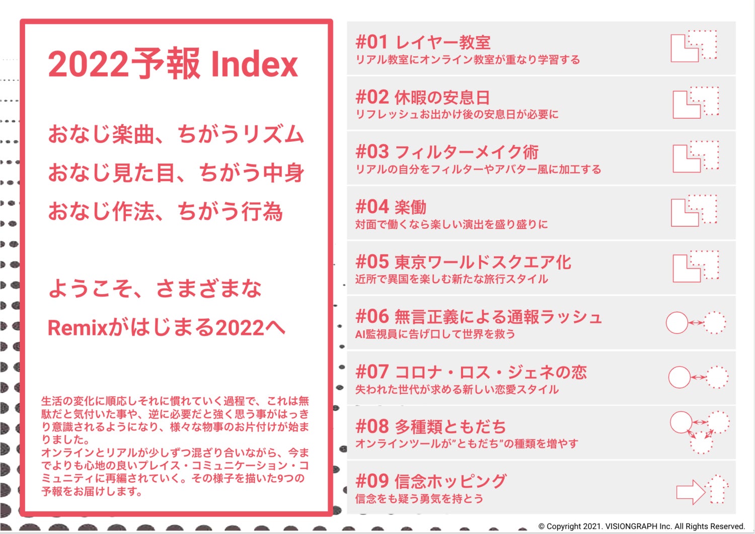 未来像をつくる専門会社「未来予報株式会社 / VISIONGRAPH Inc.」が毎年発表している翌年予報。2021年に起きた社会の変化やトレンドから未来の兆しを読み取り、2022年に起こるかもしれない9つの予報を掲載。
