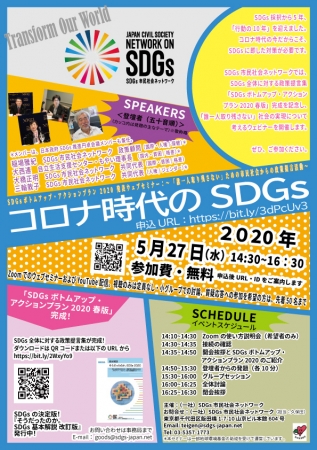 一般社団法人SDGs市民社会ネットワーク(以下、SDGsジャパン)では、SDGs全体に対する政策提言集「SDGsボトムアップ・アクションプラン2020春版」完成を記念し、「誰一人取り残さない」社会の実現について考えるウェビナーを開催します。