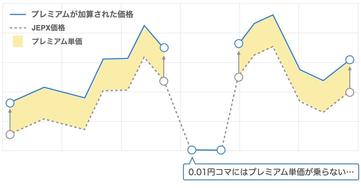 これを回避するためには、下限価格のコマでの電力販売を減らし、他のコマで販売する必要があるのですが、太陽光発電などの自然エネルギーを発電のエネルギー源とする電源は、発電量をコントロールすることができないため、下限価格となるコマが発生するとプレミアム獲得の機会損失となってしまいます。