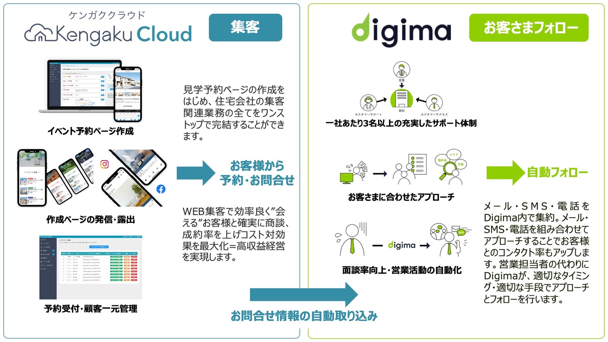 本サービス連携により、住宅会社様が当社サービス「KengakuCloud」と株式会社コンベックスが提供する「Digima」をご利用いただいている際に、「KengakuCloud」内の情報を「Digima」に自動で情報が取り込まれるようになります。