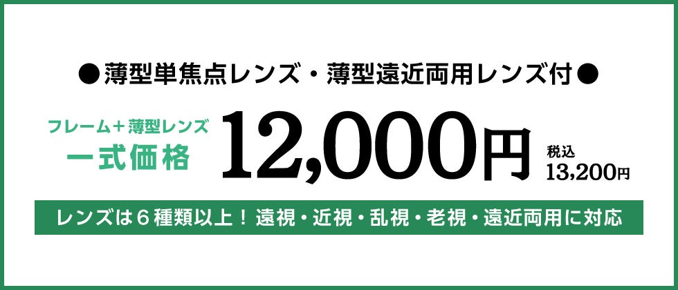 対象のメガネフレームに【薄型単焦点レンズ・薄型遠近両用レンズ】が選べて 12,000円 (税込13,200円)