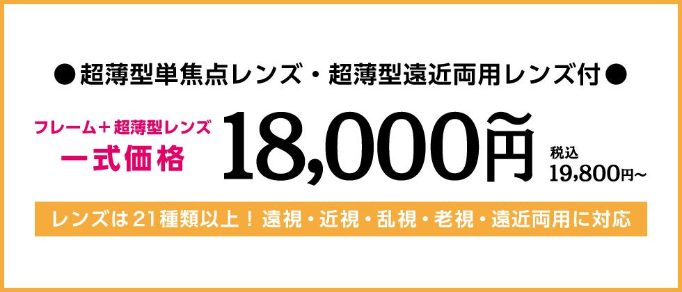 対象のメガネフレームに【超薄型単焦点レンズ・超薄型遠近両用レンズ】が選べて18,000円〜 (税込19,800円〜)