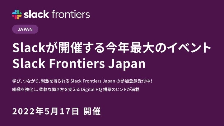 Slack(株式会社セールスフォース・ジャパン Slack、 日本韓国リージョン事業統括 常務執行役員 カントリーマネージャー 佐々木聖治、以下Slack)は本日、今年最大のイベントとなる「Slack Frontiers Japan」を2022年5月17日(火)に開催することをお知らせします。2019年以来、3年ぶりに日本で行われる今回のFrontiersは、初めてのハイブリッド開催となり、会場に登壇者およびお客様をお迎えして実施します。