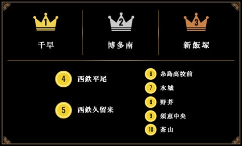 ランキングでは、福岡市東区の「千早」が1位を獲得。2018年に「香椎副都心土地区画整理事業」が完了、街並みが整備されると同時に、駅を中心としたエリアに「ガーデンズ千早」等の新たな商業施設が開業。JR鹿児島本線と西鉄貝塚線が利用でき、博多駅まで約10分と好アクセス、国道3号線 博多バイパス整備による自動車渋滞の緩和など交通利便性を評価し、1位に選出いたしました。2位には春日市の「博多南」、3位には飯塚市の「新飯塚」がランクイン。