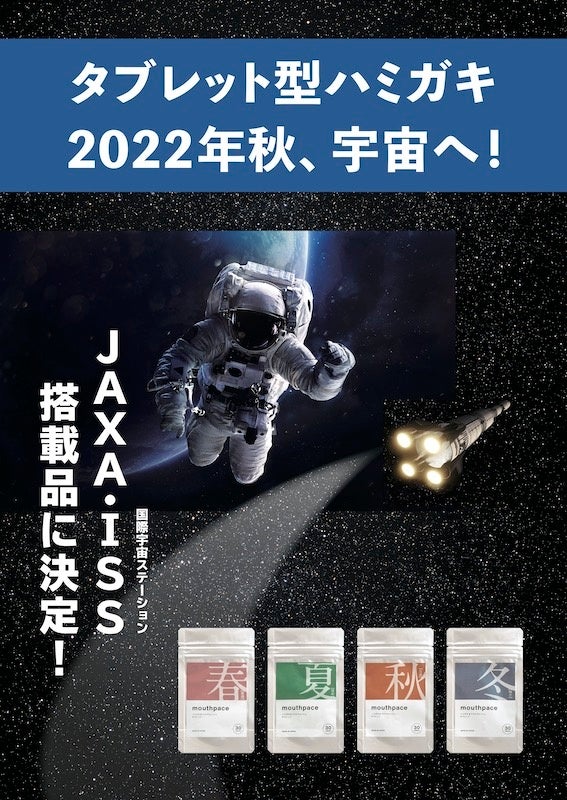 TSUYOMI株式会社の「デュアルユース・口腔ケアタブレット/mouthpace」(歯みがき&マウスウォッシュの2通り使えるタブレット型歯みがき)が、2021年11月にJAXAよりISS搭載品に選定されました。日本人宇宙飛行士のために開発した宇宙用オーラルケア製品は、2022年秋には国際宇宙ステーション(ISS)に搭載され、若田宇宙飛行士さんが使用される予定です。