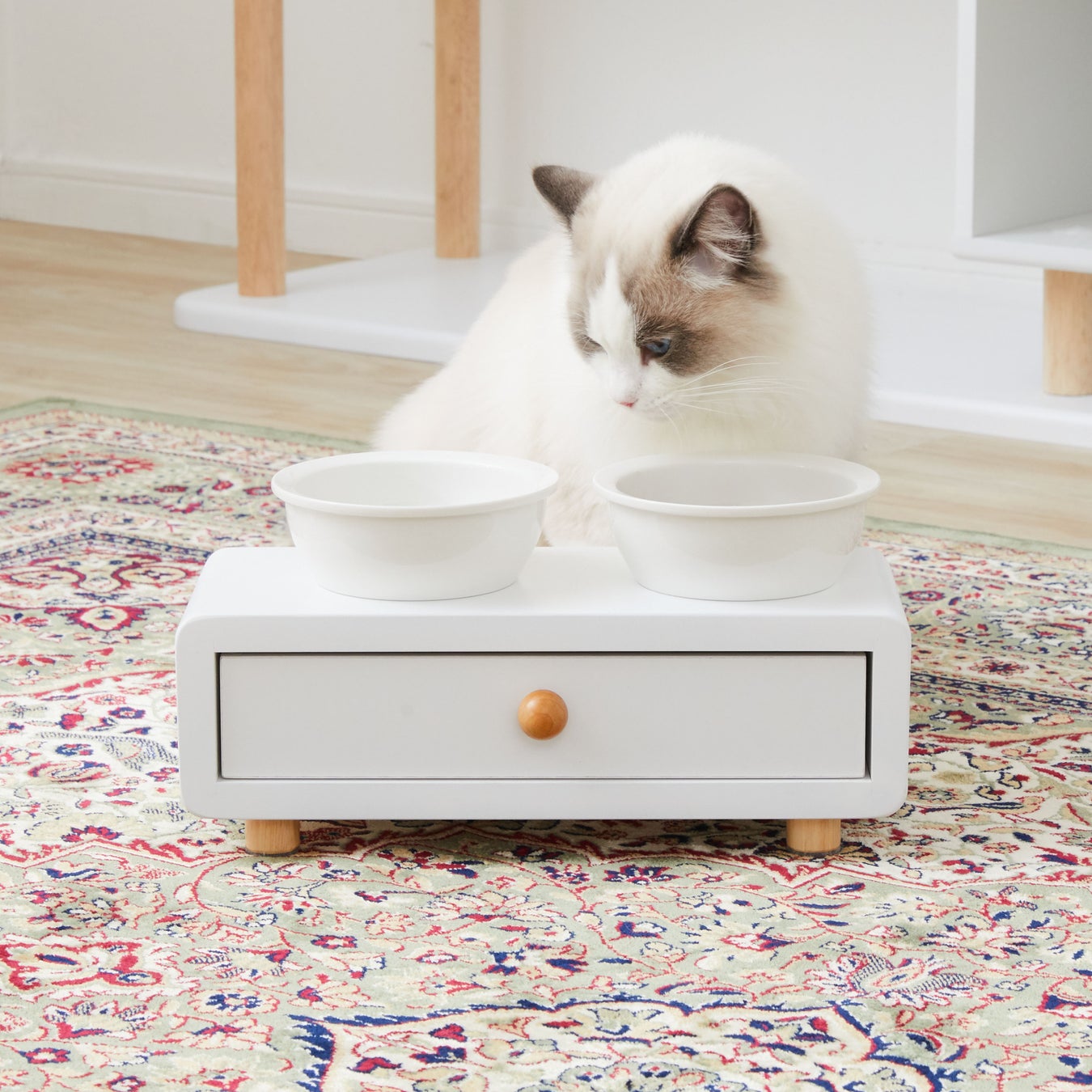 猫にとって食べやすく、飼い主にとって使いやすい設計に。猫に合わせた高さ調節ができ、猫グッズを収納できる引き出し付きです。