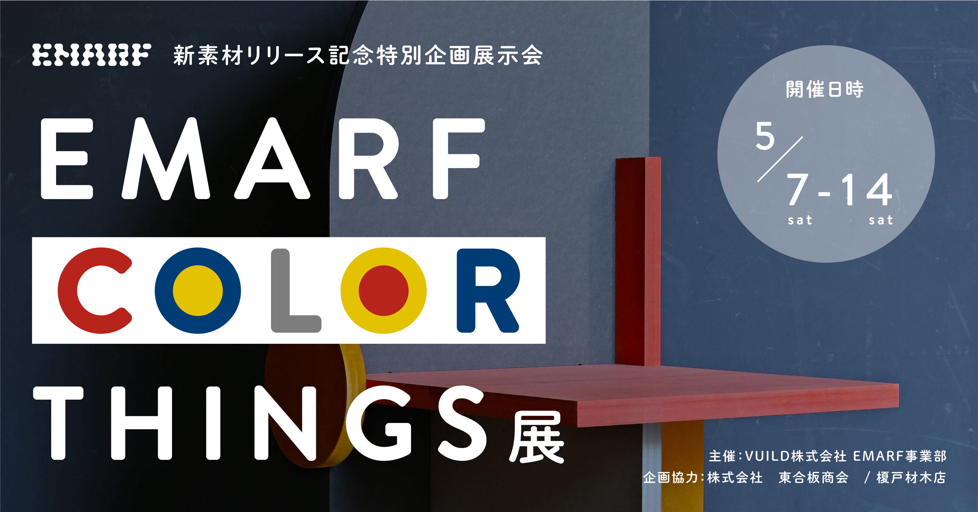 「建築の民主化」をビジョンに掲げ、オンラインものづくりサービス「EMARF(エマーフ)*¹」を提供するVUILD株式会社(ヴィルド。以下、VUILD)は、同サービス内で、新たに取り扱いを始める「カラーMDF*²」のリリース記念イベントとして、5月7日(土)から東京・新木場にある株式会社榎戸材木店にて、『EMARF COLOR THINGS EXHIBITION』と題した展覧会を開催します。