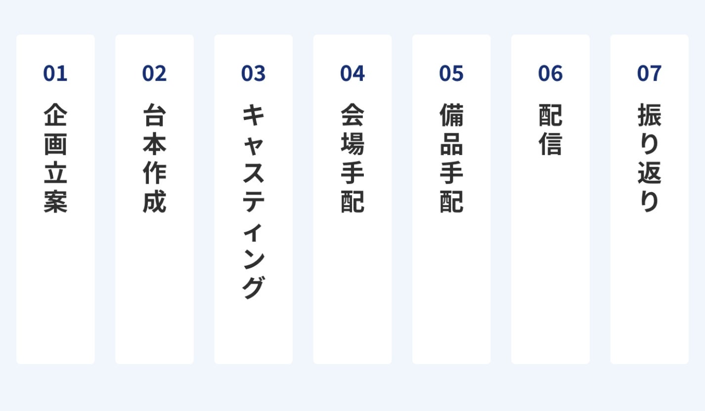 企業様が社内外に向けて、YouTube、Twitter、Instagramなどの配信プラットフォームを利用してライブ配信を行う際に、台本作成から配信オペレーションまでワンストップで代行する制作サービスです。