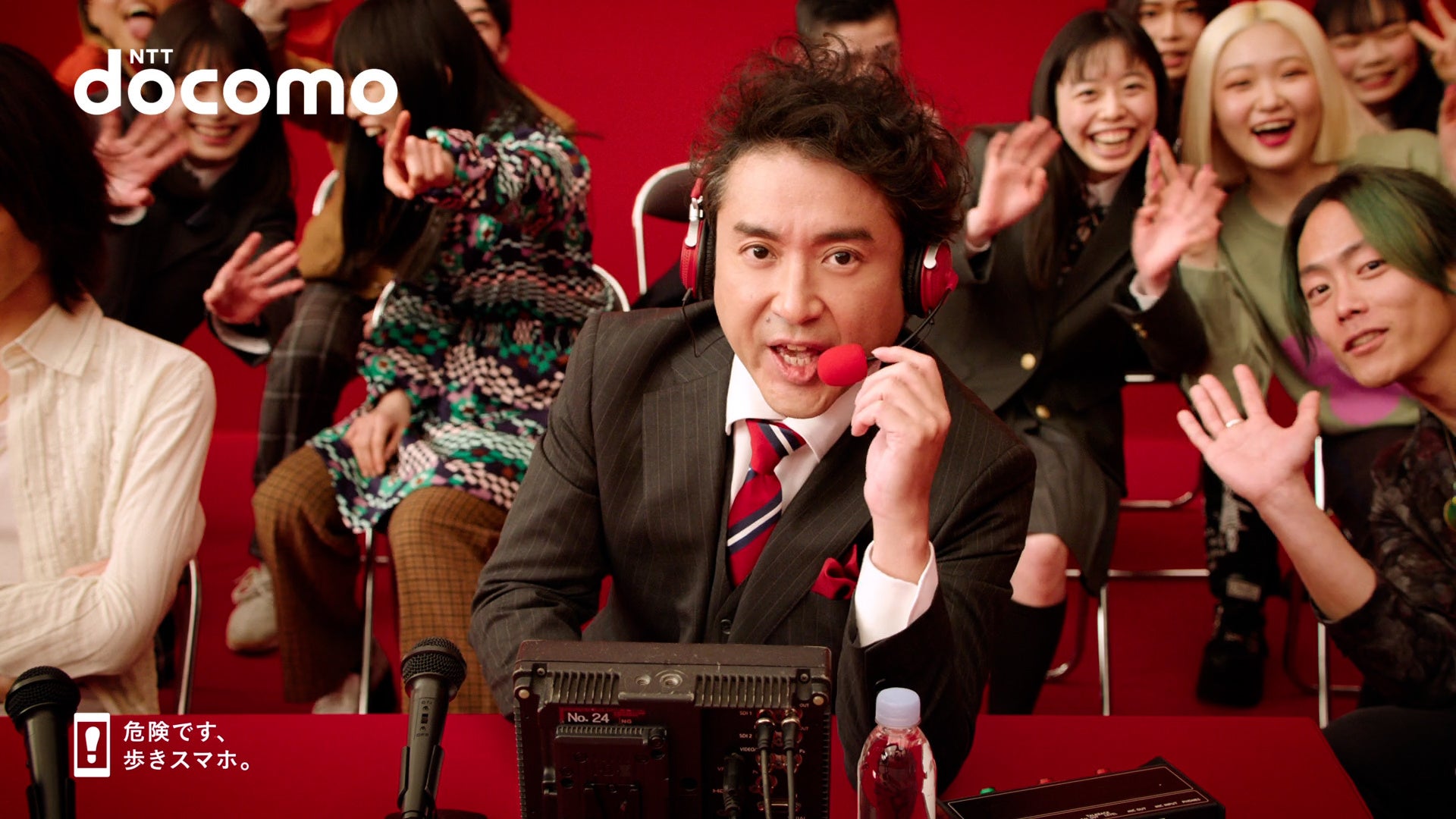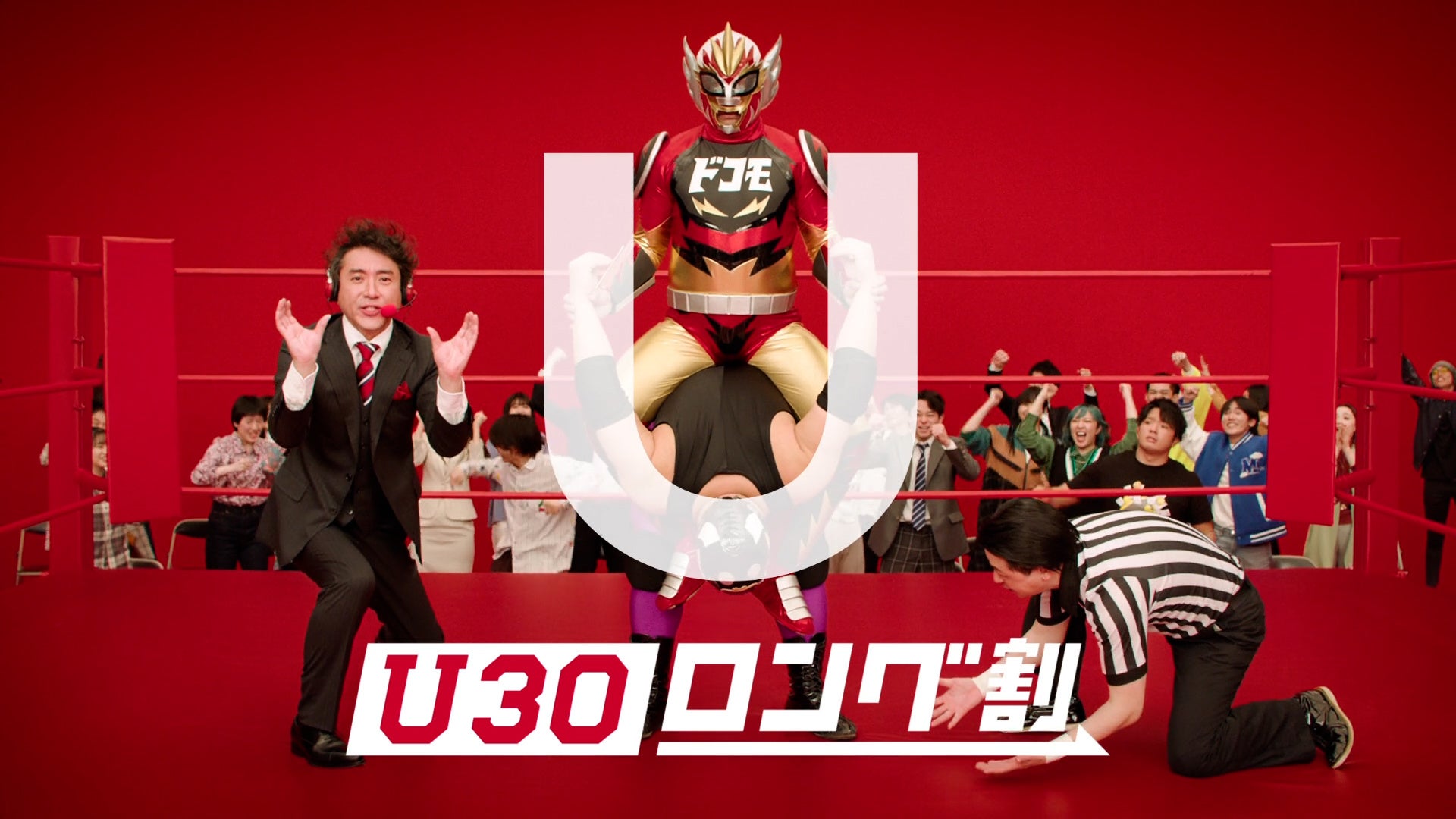 本CMは、30歳まで割引が続くサービス「U30 ロング割」をプロレスのリングを舞台にユニークに描いたCMです。 ムロツヨシさんは実況者として、赤のスーツに身を包んだ「ドコモ」と黑い覆面の「プライス」による世紀の一戦を、観客席に集まった若者と共に見守るというストーリーになっています。