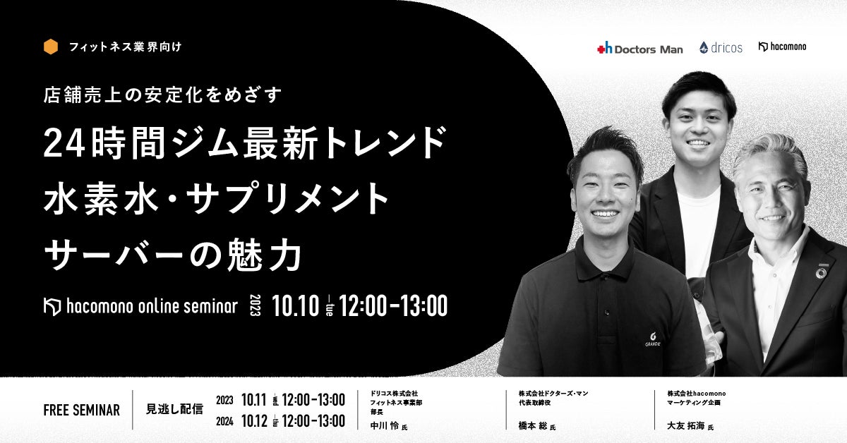 株式会社hacomono・株式会社ドクターズ・マンの2社とともにジム店舗経営における導入メリットをお話しいたします。