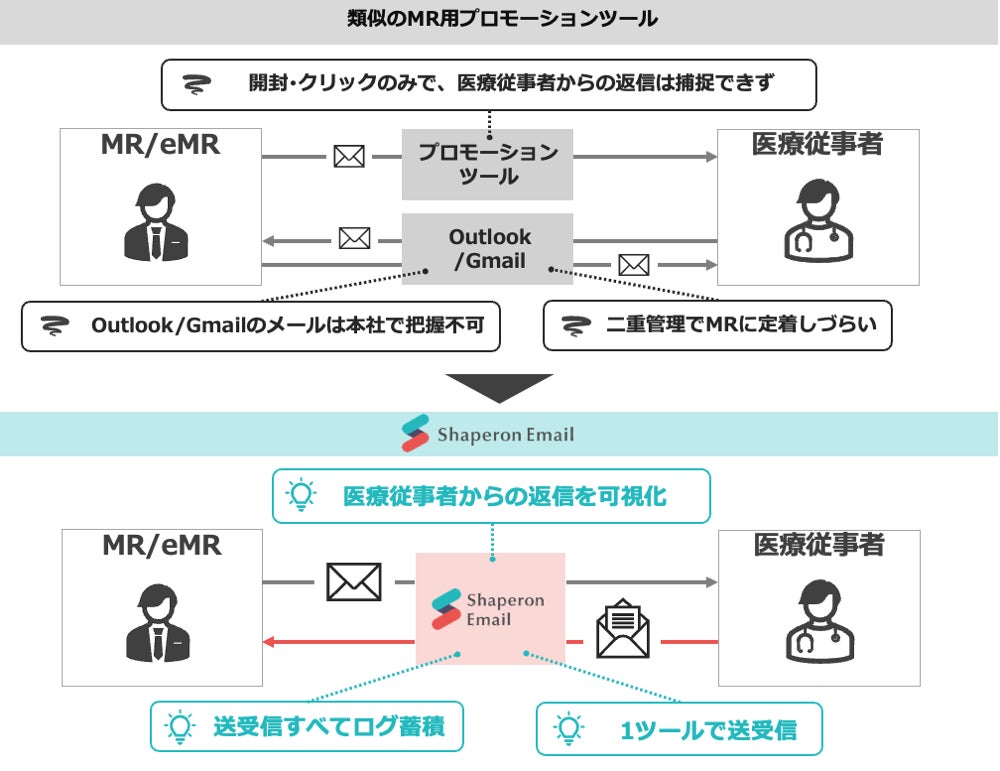 「Shaperon Email」は国内初の製薬企業向け双方向型プロモーションツールです。従来のプロモーションツールがプロモーションメールの一括配信しかできなかったのに対し、Shaperon Emailではアポ打診・御礼などの個別メールや医師からの返信も含めて、全てのメールを一元管理する事ができます。それにより、コンプライアンス強化、分析強化、MR業務の効率化が可能です。