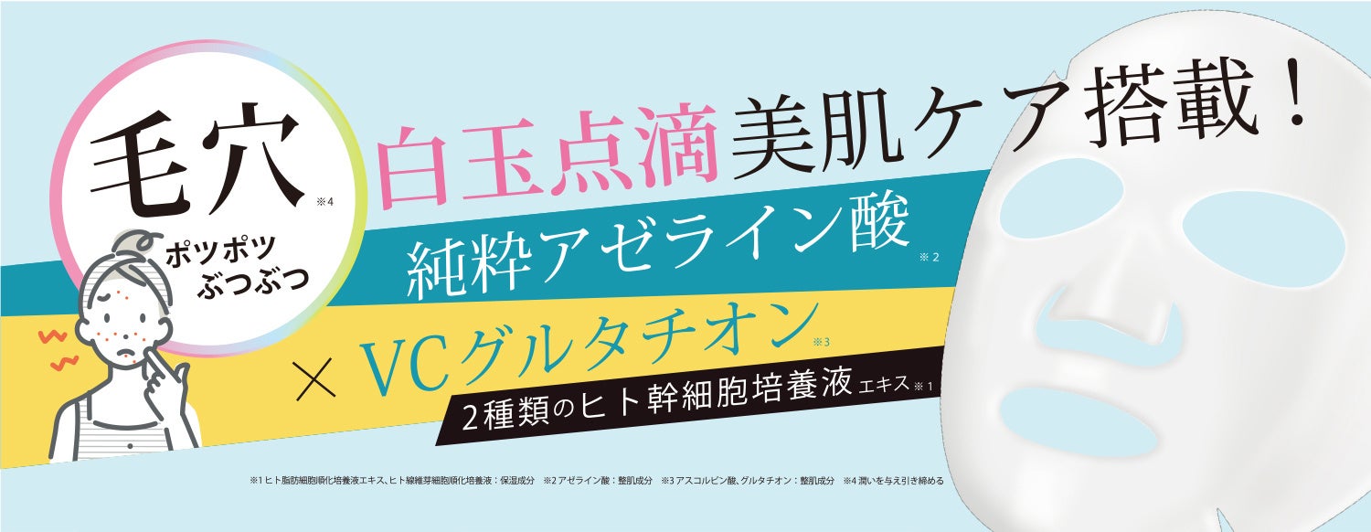 皮脂・毛穴トラブルに注目の成分「アゼライン酸」※1を配合。さらに「白玉点滴」と話題の成分「グルタチオン×V.C」※2を配合することにより、繰り返すプツプツ肌の救世主となるフェイスマスクを開発しました。
