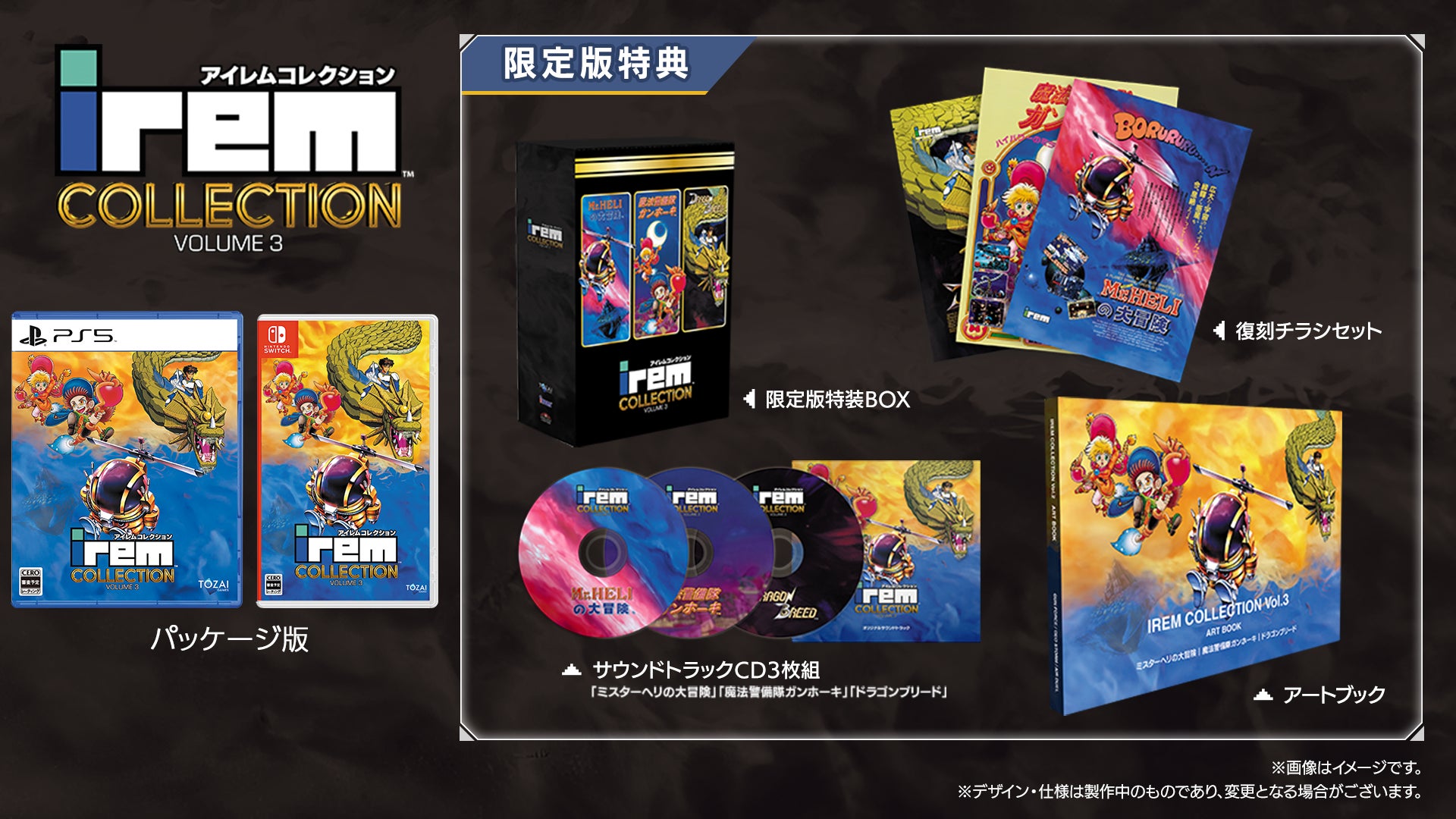 株式会社Tozai Games (神奈川県川崎市、代表取締役: 坂野 拓也、以下、Tozai Games)は、「アイレムコレクションVol.3」のダウンロード版とパッケージ版および限定版の発売日と価格を発表し、各小売店では予約の受付を開始致しました。