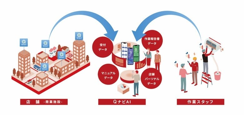 「QナビORDER」は、店舗ビジネスで突発的に発生する空調や水回り、漏電等のトラブル時に最短30秒(※1)で作業スタッフとマッチング、定期メンテナンスの管理ができるアプリサービスです。