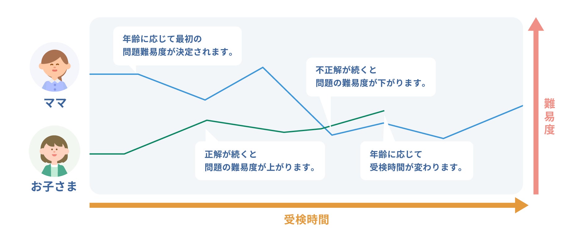 受検開始時の問題数・難易度・制限時間は、参加者の年齢に応じて自動で設定されます。受検中は、参加者の解答状況に応じて難易度がリアルタイムで変動する設計となっているため、無理なく自然に思考力を測れるだけでなく、年齢が異なる参加者とも対等に競い合うことが可能です。
