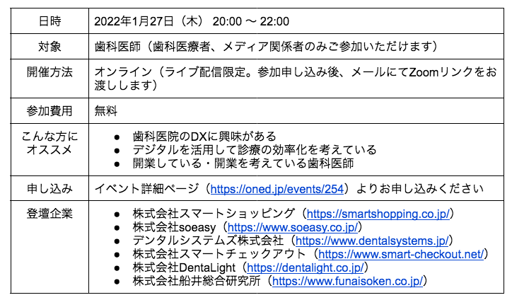 - 登壇企業:株式会社スマートショッピング(https://smartshopping.co.jp/)、株式会社soeasy(https://www.soeasy.co.jp/)、デンタルシステムズ株式会社(https://www.dentalsystems.jp/)、株式会社スマートチェックアウト(https://www.smart-checkout.net/)、株式会社DentaLight(https://dentalight.co.jp/)、株式会社船井総合研究所(https://www.funaisoken.co.jp/)