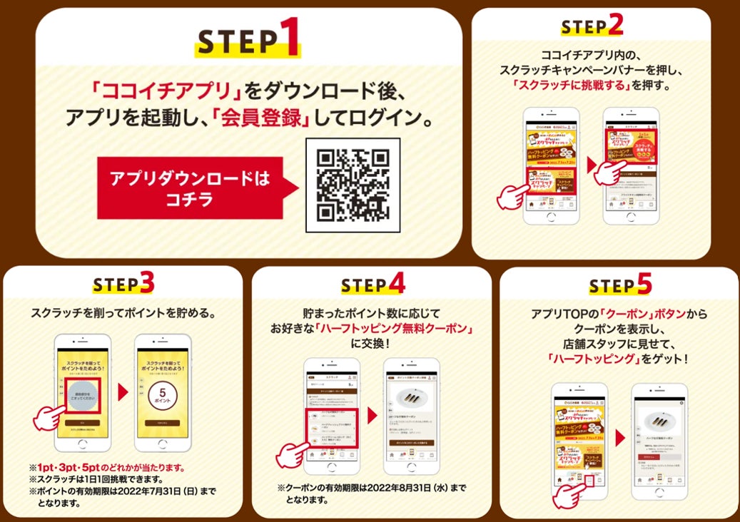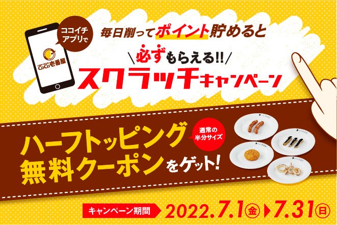 カレーハウスCoCo壱番屋(株式会社壱番屋、本社:愛知県一宮市、代表取締役社長 葛原 守)は、2022年7月1日(金)より、公式アプリで「毎日削ってポイントを貯めると必ずもらえる!!スクラッチキャンペーン」を実施いたします。