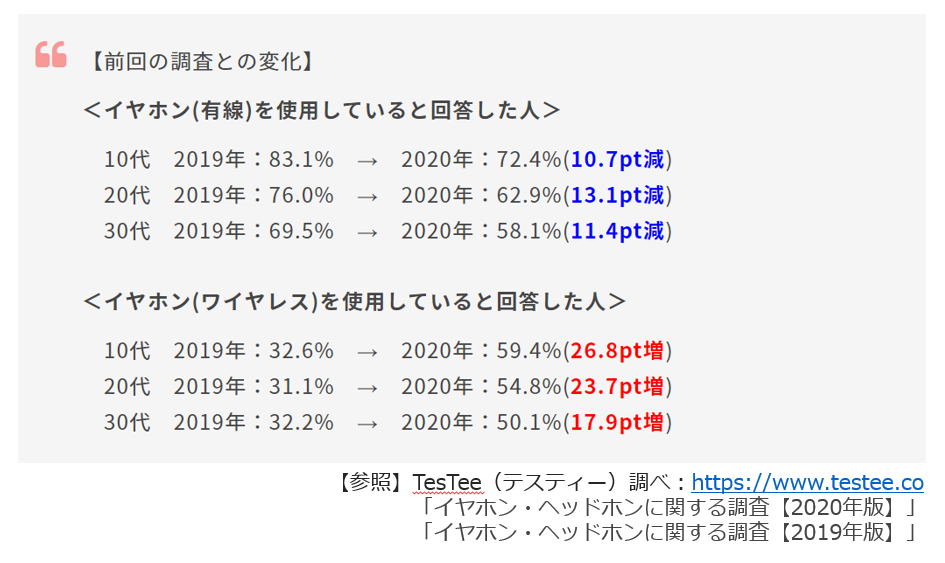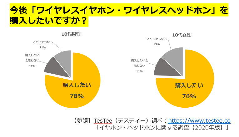 さらに昨今ではコロナ禍におけるオンライン授業の導入や情報通信教育の強化などにより、パソコン/タブレット等勉強でもITデバイスを使用する場面が増えているため、これに比例してイヤホン・ヘッドホンの使用時間も増加していくことが見込まれます。