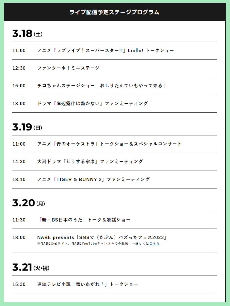 イベントの模様を全国の皆様にも楽しんでいただきたく、以下のステージプログラムは、NHKオンラインやYouTubeのNHKチャンネル、メタバース超体験NHKフェス会場でライブ配信を行う予定です。詳しくは、公式サイトhttps://www.nhk.or.jp/event/cho-nhkfes/ でご確認ください。