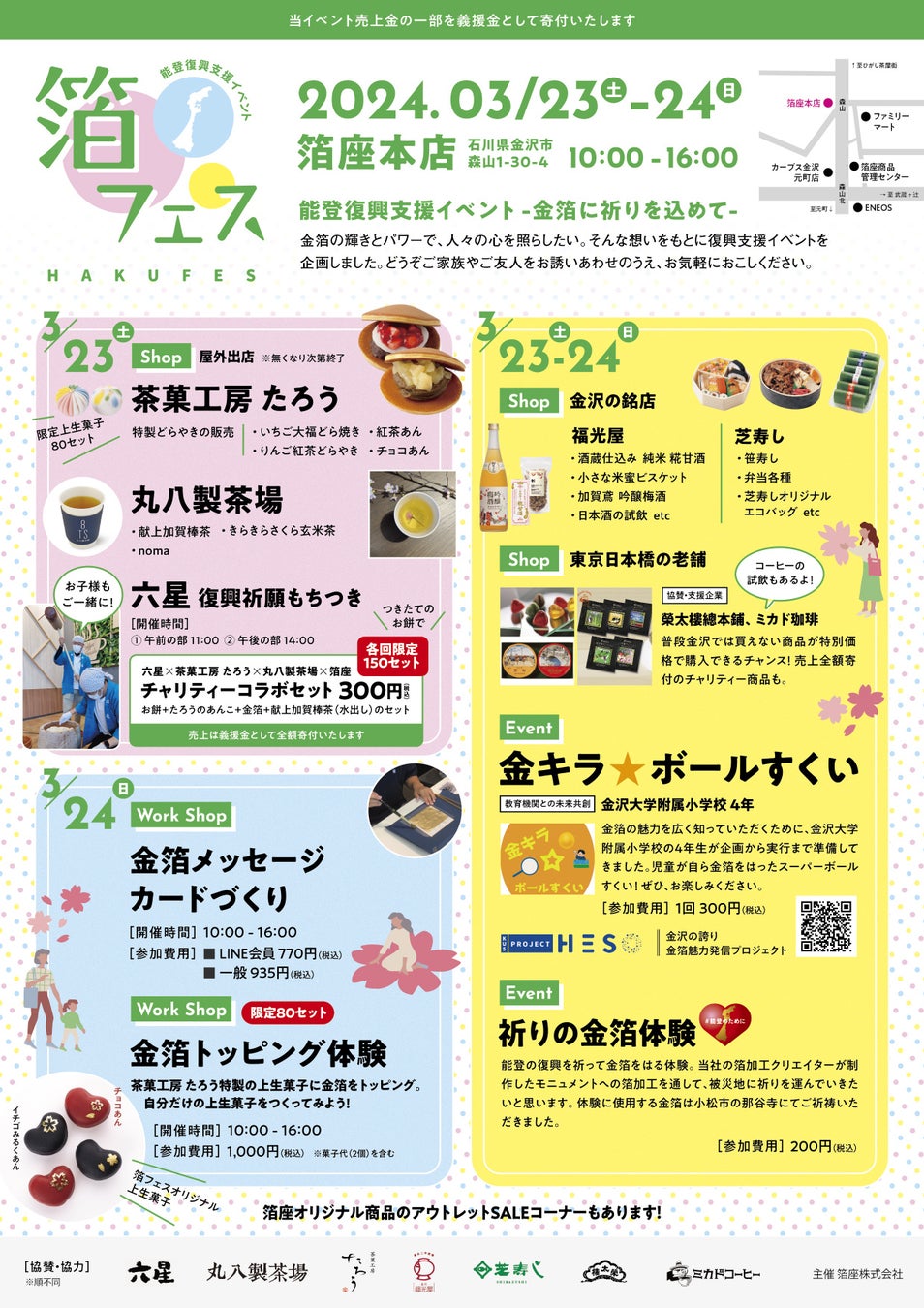 金箔製造販売の箔座株式会社(石川県金沢市森山、代表取締役社長 高岡美奈、以下箔座)は、2024年3月23日(土)・24日(日)、「箔座本店」(石川県金沢市森山)にて、能登復興支援イベント「箔フェス」を開催します。