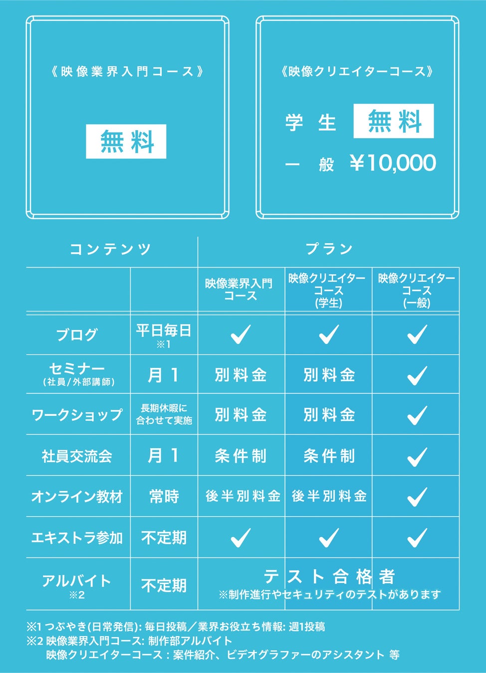 学生会員は「映像業界入門コース」と同プランですが、アルバイトの紹介内容が異なります(ビデオグラファーのアシスタントや案件紹介等)。