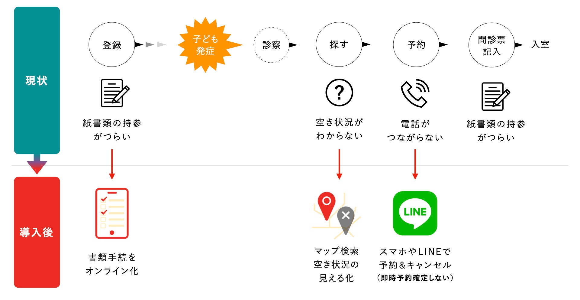 内閣府の調査(※)によると、全国の病児保育室の利用率は約30%と言われています。十分に活用されていない大きな原因は、認知不足に加え、電話予約に代表される使いづらい仕組みであると考えられます。