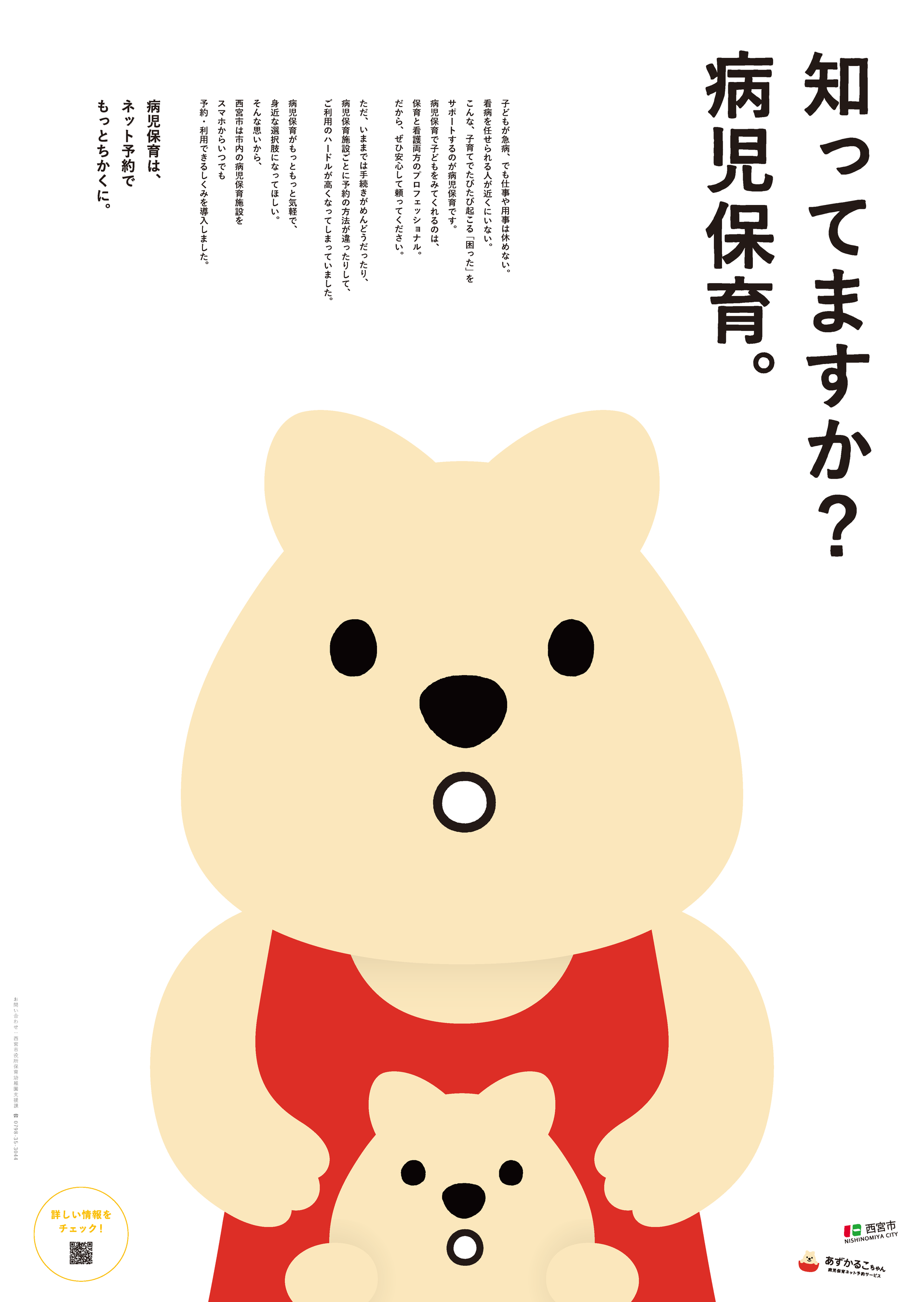 また、本取り組みと病児保育事業自体の周知強化を目的としたパンフレットやポスターを制作し、西宮市市内の保育園等で配布掲示を行います。病児保育の利用、運営、啓蒙にあずかるこちゃんが力になれるよう、今後もサービス提供を推進していきます。