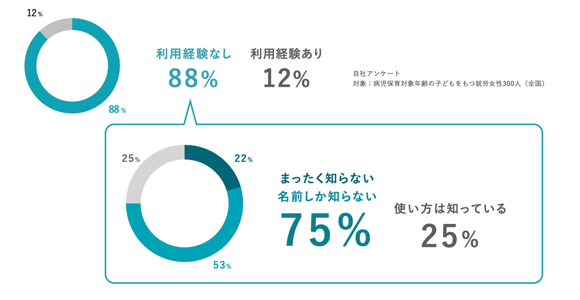 弊社が全国の子どもを持つ就労女性300人にアンケートを行ったところ、「病児保育の利用経験がない」と答えた方は88%にのぼりました。さらに病児保育を利用したことがない方に、病児保育について知っているか聞くと、75%が「知らない」もしくは「名前しか知らない」と回答しました。また、アンケート結果から、手続きの煩雑さが利用を遠ざけているということも分かりました。