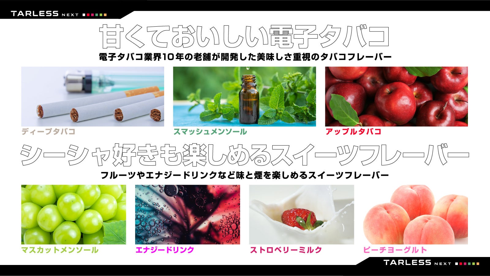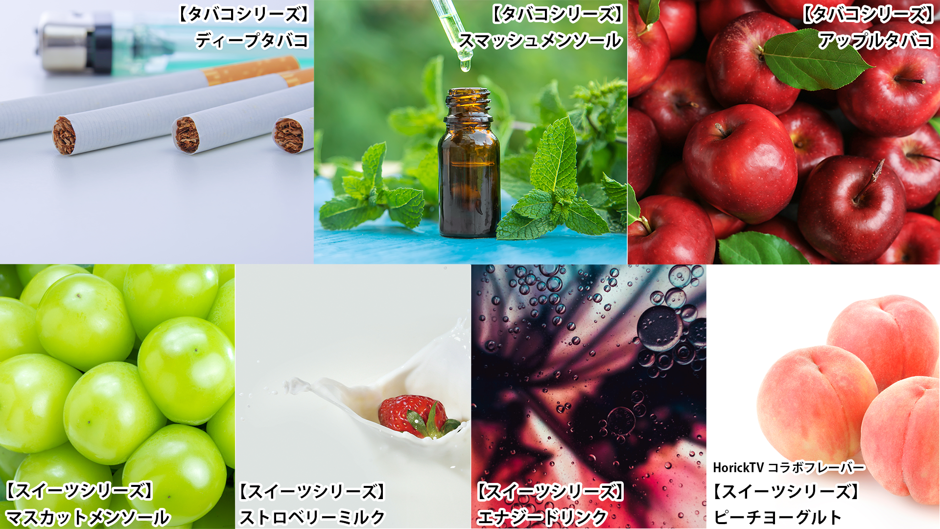 喫煙者にとっては衝撃の『甘くて美味しいタバコフレーバー』が3種、シーシャ好きにとっては大満足の『スイーツフレーバー』が4種のフレーバーを採用。