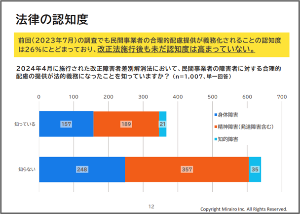 「2024年4月に施行された改正障害者差別解消法において、民間事業者の障害者に対する合理的配慮の提供が法的義務になったことを知っていますか?」という設問に対しては、「知っている」と回答した障害者は36%でした。すべての障害種別で「知っている」よりも「知らない」が多く、障害者の間でも合理的配慮の提供が義務化されたことの認知度は、改正法が施行された後も高まっていないことがわかります。