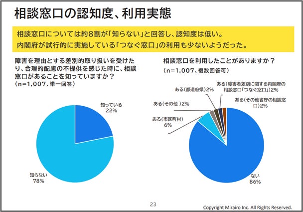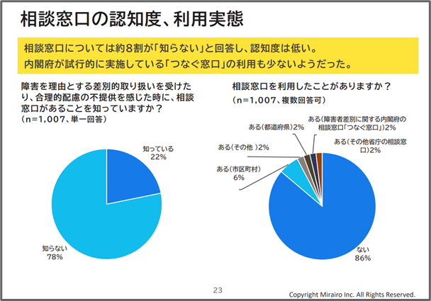 行政がもうけている相談窓口の認知度、利用実態についてもアンケートで聞いたところ、そもそも相談窓口があることを知らない障害者が約8割近くにのぼり、利用したことがある方も約15%と低い水準であることがわかりました。改正障害者差別解消法では内閣府が中心となって相談窓口を明確化することが基本方針として掲げられており、内閣府が「つなぐ窓口」を試行事業として2023年10月からスタートさせています。その「つなぐ窓口」※も、「利用したことがある」と回答した障害者は約2%に留まっています。