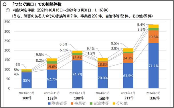 令和6年版障害者白書(URL:https://www8.cao.go.jp/shougai/whitepaper/r06hakusho/gaiyou/pdf/r06gaiyou.pdf)によれば、「つなぐ窓口」での相談件数は、試行開始時の2023年10月から半年で1,163件という結果でした。なお、この数字には、事業者からの相談件数も含まれています(下図参照)。