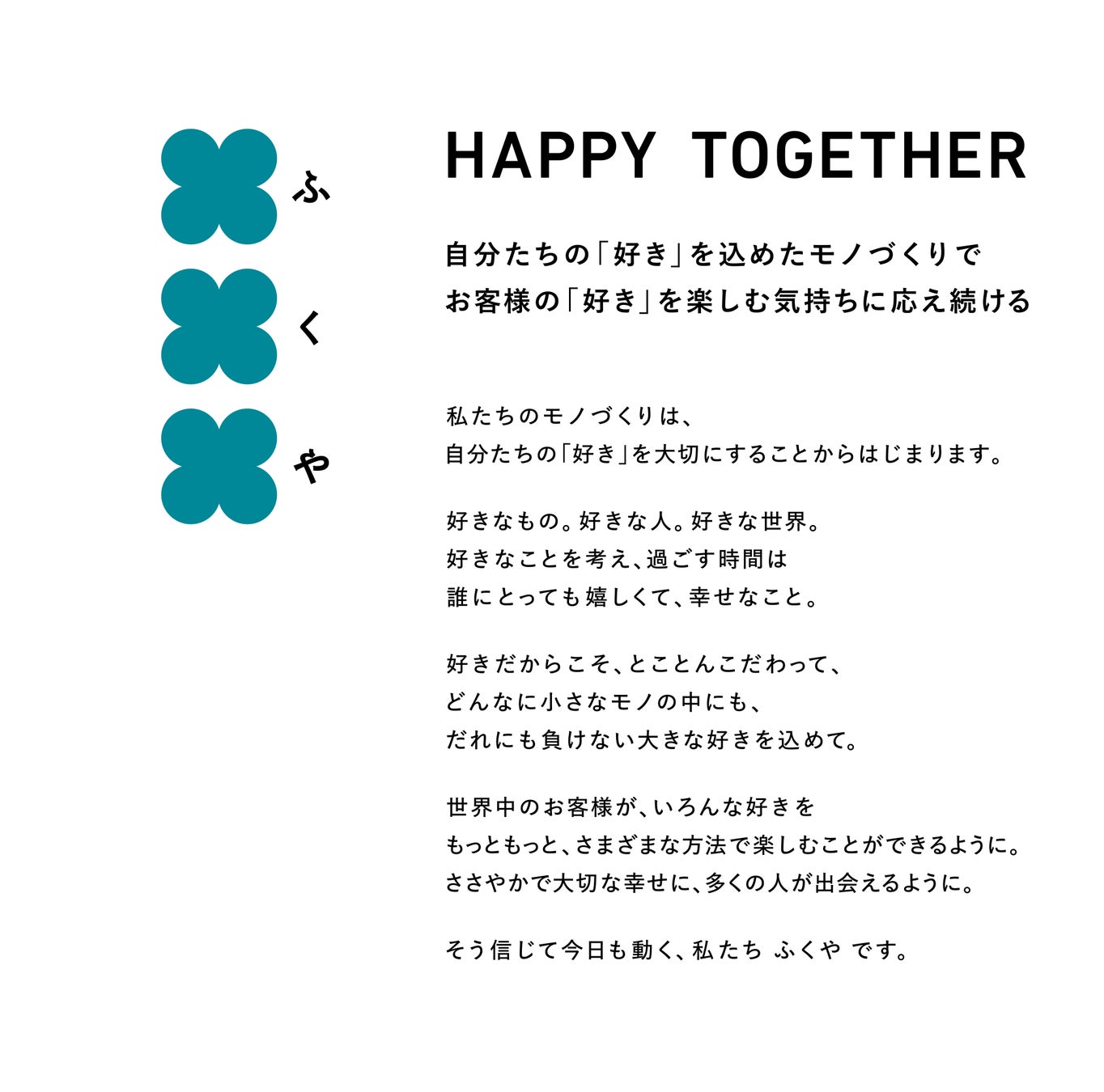 新しいロゴは、幸運の象徴である四葉のクローバーをモチーフにデザインされています。単なる製品提供ではなく、四葉のクローバーを見つけた時のような嬉しさを感じる出会いをお客様に提供し、モノを超えた幸せや喜びを届けるというふくやの想いを象徴しています。また同じ形の3つのクローバーが並ぶことで幸運感を表現、「ふくや」という社名の3音を象徴するとともに、ふくやの掲げる理念である「Happy Together」を視覚的にも体現。モノづくりを通して人々に笑顔を届け、その幸せが世界中に広がっていくことを願うというブランドの想いも込められています。穏やかな青と活き活きとした緑をあわせたブルーグリーンのカラーは、世界との調和と豊かな成長を象徴しています。またこのブルーグリーンは、クローバーが野原に広がり育っていくように、ブランドの価値をこの世界に広げていこうというふくやの決意を伝えています。