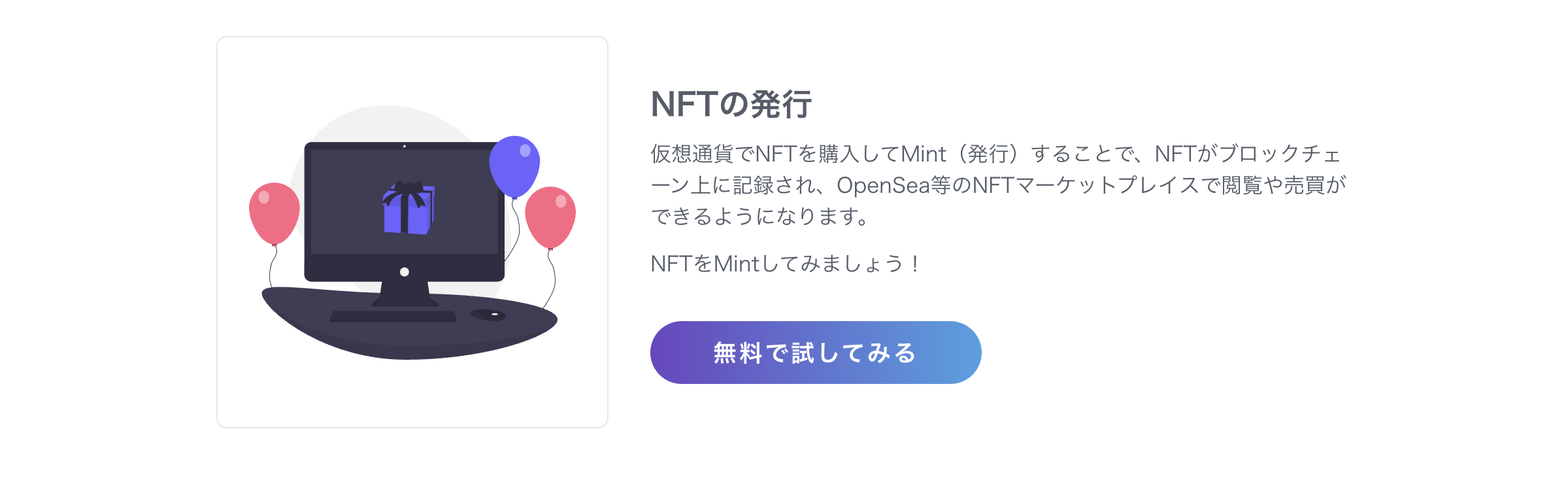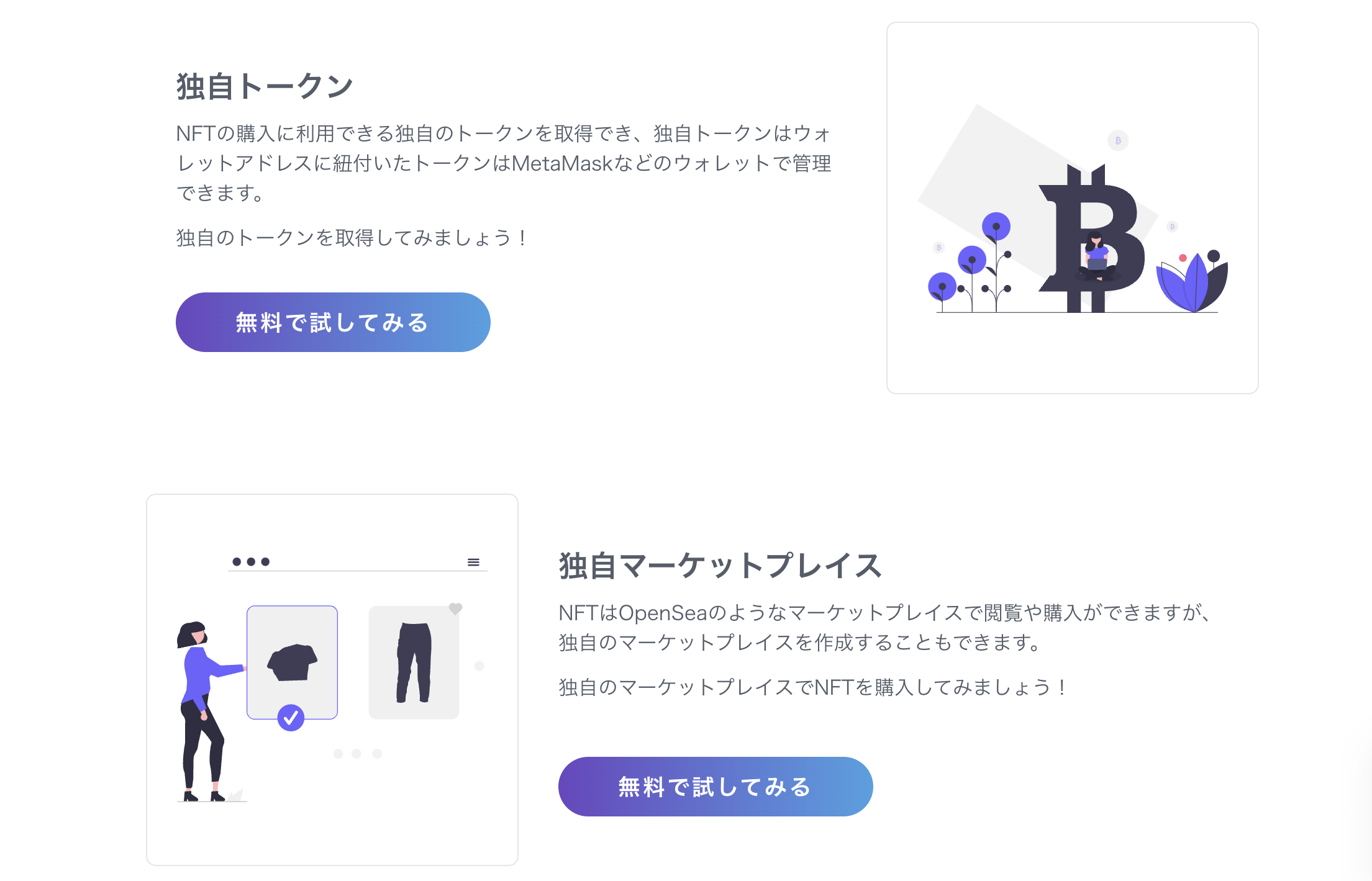 サンプルは、NFTの発行、独自トークンの発行、独自マーケットプレイス、NFT購入者限定ページなどを無料で体験することができ、NFTサービスを提供するイメージを掴んでいただくことができます。