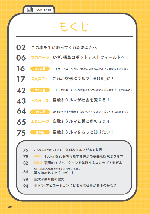 空飛ぶクルマの開発、日本の航空機の歴史、そして20年後の未来がどのような世界になるのか。小学生以上であれば十分理解でき、空飛ぶクルマにまつわる世界を親子で楽しめます。順次、書店での販売も始まります。